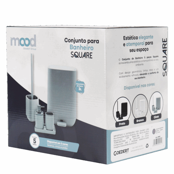 Referência: 58682Estética elegante e atemporal para seu espaço! O Conjunto de Banheiro 5 peças Square acrescenta uma estética contemporânea ao seu ambiente. Com design geométrico, linhas retas e um acabamento refinado, elevando o conforto do seu banheiro. Disponível nas cores: Preto, Branco e Cinza Contém 5 itens: Lixeira pedal 3 Litros Dispensador de sabonete liquido 320ml Escova sanitária com suporte Porta escova dental Bandeja de apoio