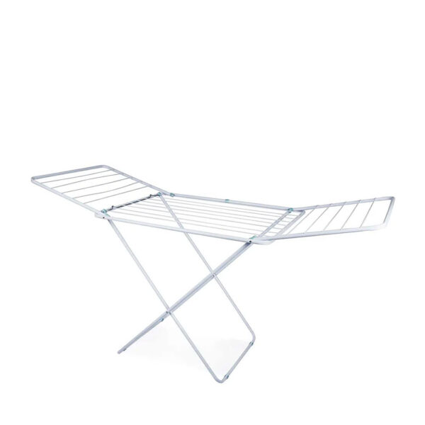 Referência: 43484Ideal para quem busca praticidade e qualidade em um mesmo produto, o Varal de Chão com Abas Maxi otimiza seu espaço para pendurar roupas além de ser fácil de guardar, já que pode ser dobrado e cabe em qualquer lugar. Produzido em tubo de aço com acabamento em pintura epóxi a pó e peças plásticas de polipropileno, inclusive as sapatas nos pés que protegem o piso de possíveis danos. Possui oito varetas no centro e duas abas com cinco varetas cada que comportam aproximadamente 16,2m de roupas ou 25Kg de roupas úmidas distribuídas uniformemente.